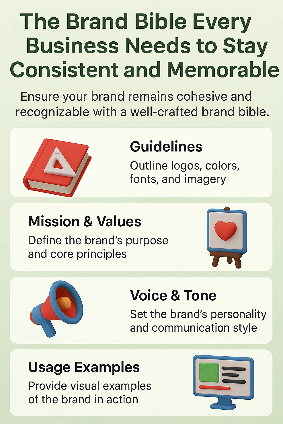A brand bible is the cornerstone of consistency. It brings together the core elements of a brand — mission, values, voice, logo, colors, fonts, and imagery — into one clear guide. Without it, businesses often struggle with fragmented messaging and visuals that confuse customers.