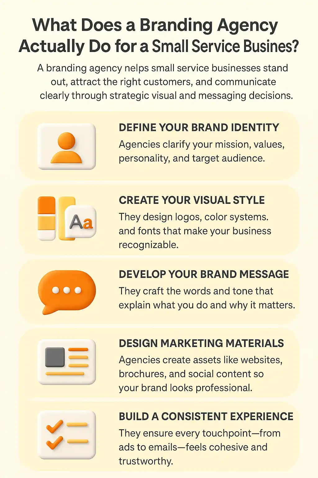 A branding agency plays a crucial role in helping small service businesses define who they are, how they communicate, and why customers should choose them over competitors. Unlike simple design studios that focus solely on visuals, a branding agency looks at the entire identity of your business—its purpose, strengths, customer experience, and long-term goals—and shapes these into a clear and compelling brand.